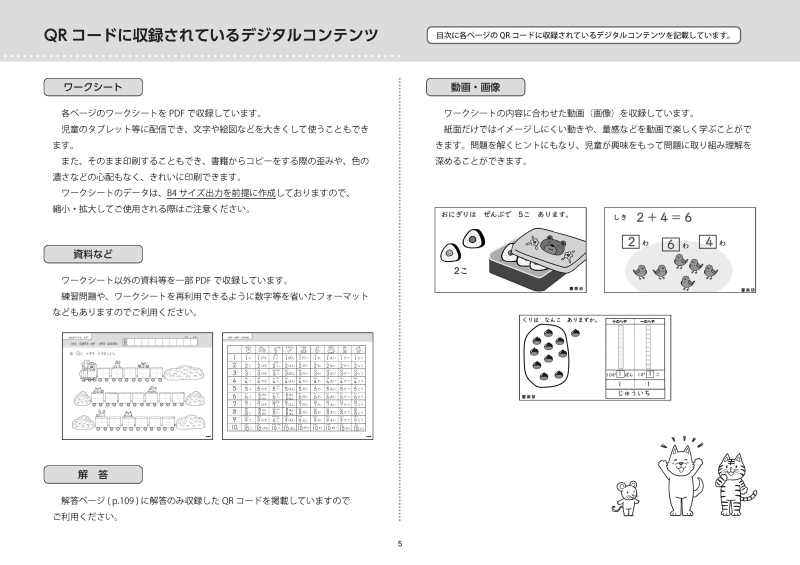 ・楽しいイラストや題材を豊富に使い,子どもたちが楽しく算数を学べるように工夫してあります。また,どの子も無理なく取り組めるように,各学年での重要な内容にしぼり,問題数も少なくしてあります。