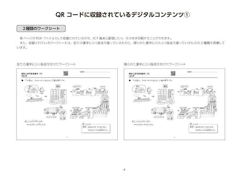 ・QRコードには,ワークシートに沿った映像や動画,イラストなどが入っています。児童のタブレットに配信して見せることで,わかりやすく説明できます。