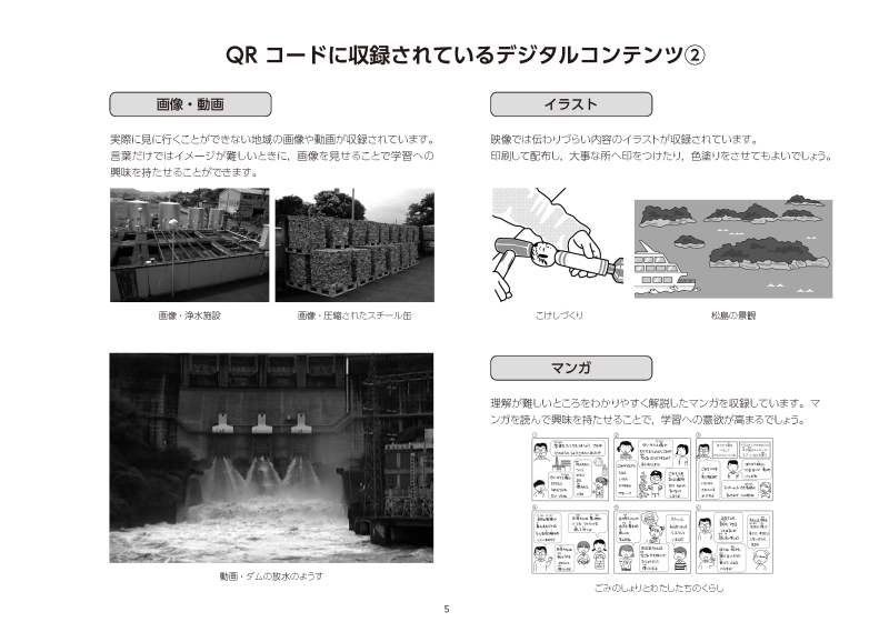 ・QRコードには,ワークシートに沿った映像や動画,イラストなどが入っています。児童のタブレットに配信して見せることで,わかりやすく説明できます。