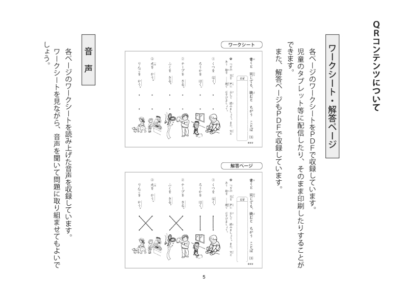 ・QRコードには,「各ページのワークシート」「ワークシートを読み上げた音声」を収録しています。ワークシートを見ながら音声を聞いて問題に取り組むことができます。