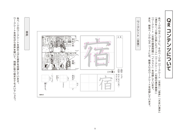 ・QRコードには,「各ページのワークシート」「音声」「大きい漢字」「漢字を二、三個に分割したパーツ」