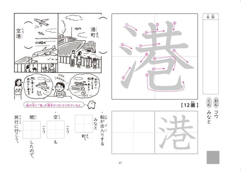 ・おもしろい場面のイラストやマンガを使い,漢字の読み書きが楽しく学習できるように工夫しています。