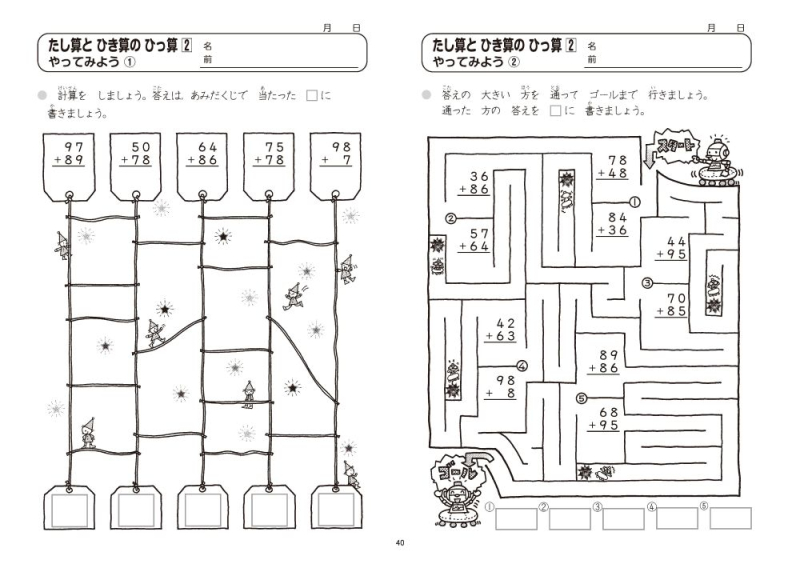 ◆ 迷路やあみだくじ,線つなぎ,色ぬり問題があり,楽しく学習できます。