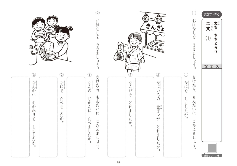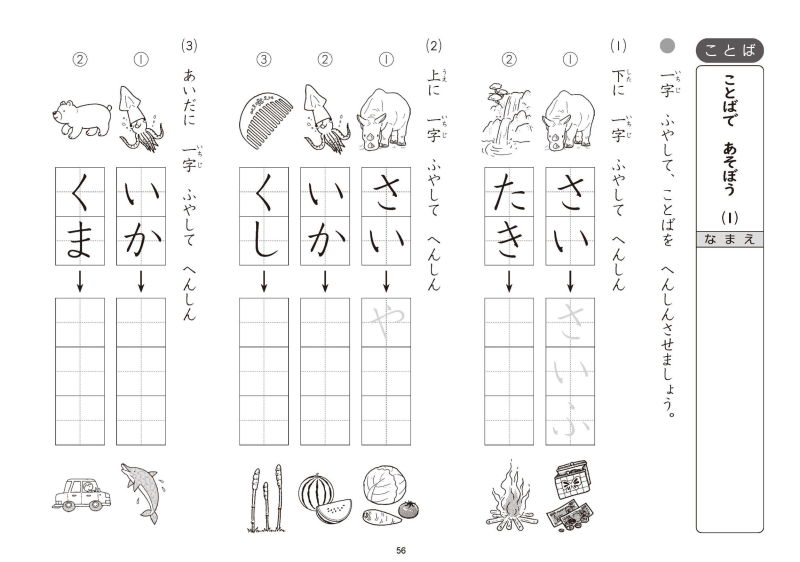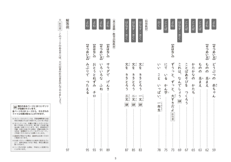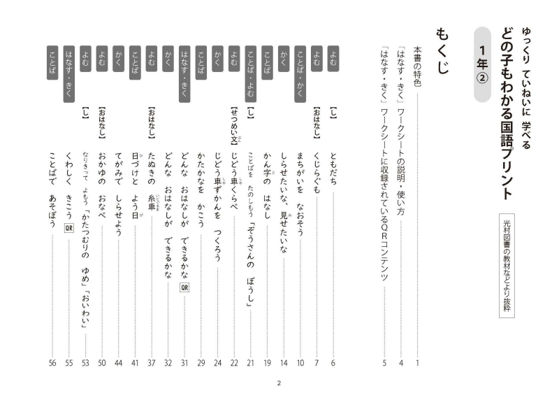 ともだち/くじらぐも/まちがいをなおそう/しらせたいな、見せたいな/かん字のはなし/ぞうさんのぼうし/じどう車くらべ/じどう車ずかんをつくろう/かたかなをかこう/どんなおはなしができるかな/たぬきの糸車/日づけとよう日/てがみでしらせよう/おかゆのおなべ/かたつむりのゆめ/おいわい/くわしくきこう/ことばであそぼう/どうぶつの赤ちゃん/ものの名まえ/かたかなのかたち/ことばあそびをつくろう/これは、なんでしょう/ずうっと、ずっと、大すきだよ/にているかん字/いいこといっぱい、一年生
