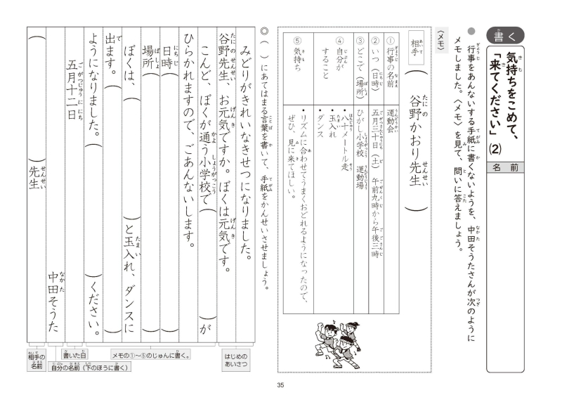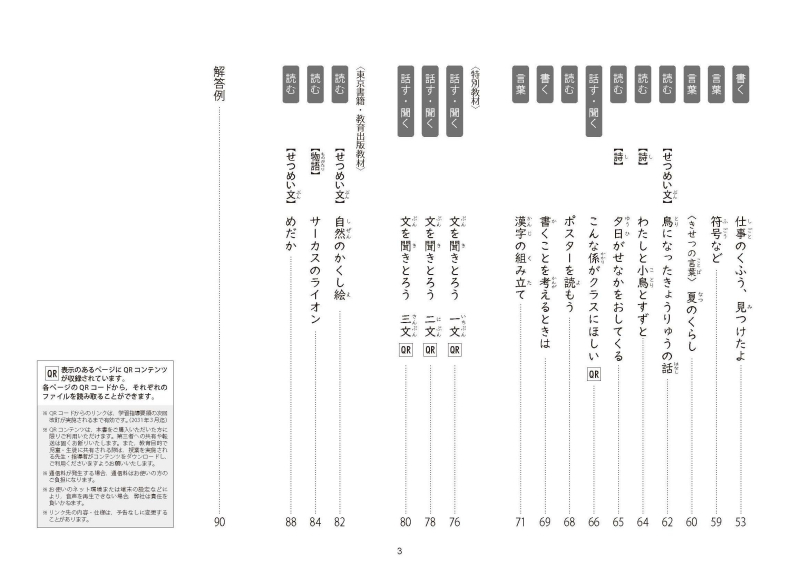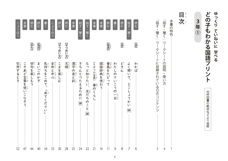 わかば/よく聞いて、じこしょうかい/どきん/わたしのさいこうの一日/春風をたどって/国語辞典を使おう/春のくらし/もっと知りたい、友だちのこと/きちんとつたえるために/漢字の音と訓/文様/こまを楽しむ/全体と中心/気持ちをこめて、「来てください」/まいごのかぎ/俳句を楽しもう/こそあど言葉を使いこなそう/引用するとき/仕事のくふう、見つけたよ/符号など/夏のくらし/鳥になったきょうりゅうの話/わたしと小鳥とすずと/夕日がせなかをおしてくる/こんな係がクラスにほしい/ポスターを読もう/書くことを考えるときは/漢字の組み立て