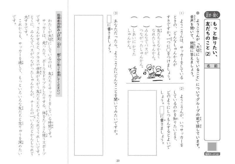・「話す・聞く」「書く」「読む」「言葉」の4領域を掲載しています。「話す・聞く」シートには,QRコードが各ページについています。学習シートの他に,音声が入ったものもあります。