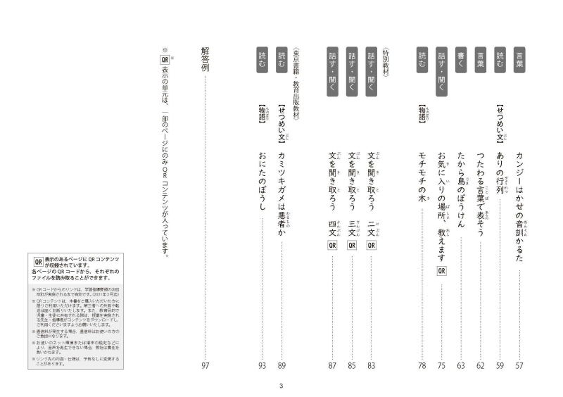・「話す・聞く」「書く」「読む」「言葉」の4領域を掲載しています。「話す・聞く」シートには,QRコードが各ページについています。学習シートの他に,音声が入ったものもあります。