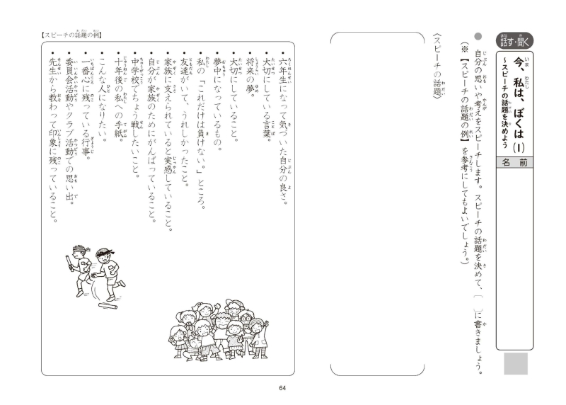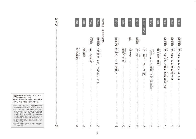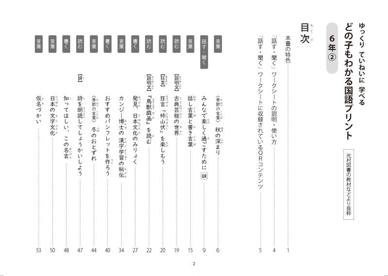 秋の深まり/みんなで楽しく過ごすために /話し言葉と書き言葉/古典芸能の世界/狂言「柿山伏」を楽しもう/『鳥獣戯画』を読む/発見、日本文化のみりょく/カンジ―博士の 漢字学習の秘伝/おすすめパンフレットを作ろう/冬のおとずれ/詩を朗読してしょうかいしよう/知ってほしい、この名言/日本の文字文化/仮名づかい/考えることとなやむこと/考えることを考え続ける/考える人の行動が世界を変える/日本語の特徴/大切にしたい言葉~卒業文集に向けて/今、私は、ぼくは/海の命/生きる/表現の工夫/平和のとりでを築く